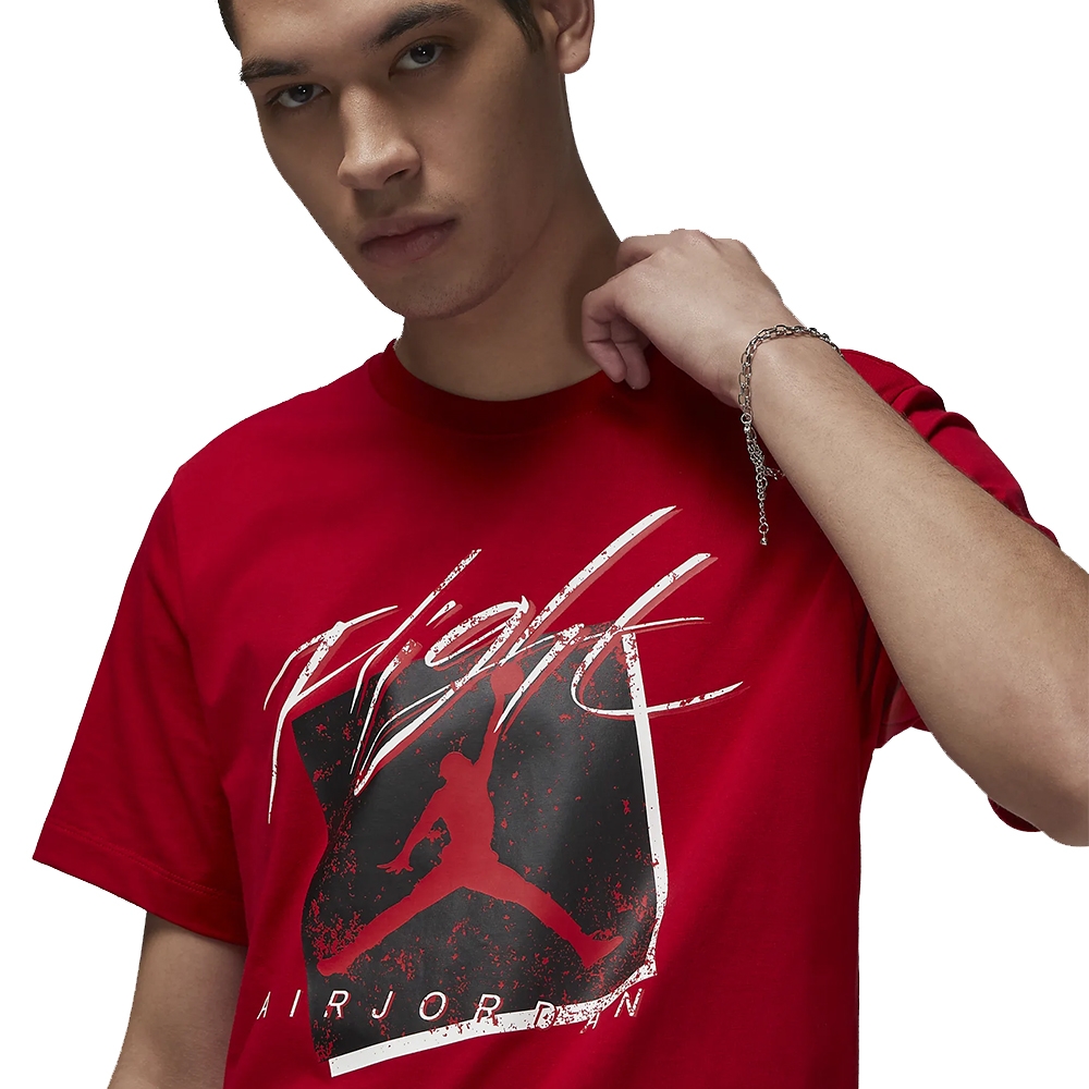 Дизайн футболки выдержан в стиле Air Jordan, который уже десятилетиями вдохновляет поклонников спорта и стиля. Яркий красный цвет создает эффектный контраст с черным графическим принтом, что придает модели неповторимый характер. Футболка Jordan Flight это не просто одежда, это путь выразить свою индивидуальность и любовь к культовому бренду.