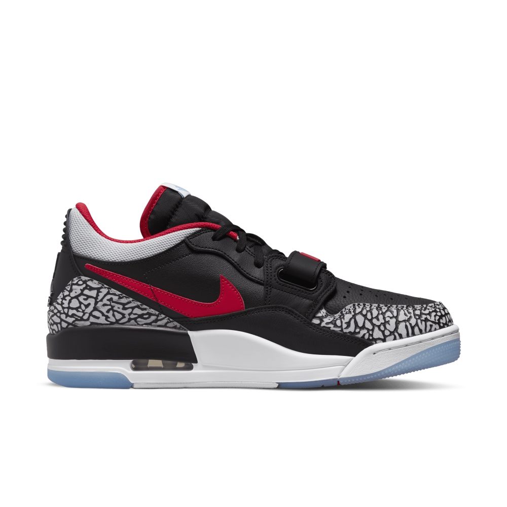 Кроссовки Jordan Legacy 312 Low Black Valor Blue сочетают в себе элементы Air Jordan 1, Air Jordan 3 и Nike Air Alpha Force Low, а их цветовая гамма вдохновлена флагом Чикаго. Кроссовки Jordan Legacy 312 представлены в черной/красной/синей и в сером цвете и имеют верх из черной мятой кожи с контрастными кожаными логотипами Swoosh, синими на боковой стороне и красными на средней. Пятка и перфорированный носок покрыты серой кожей с принтом слона. Подошва из белого пеноматериала имеет видимую вставку Air, а резиновая подошва выполнена в белом и полупрозрачном синем цвете.