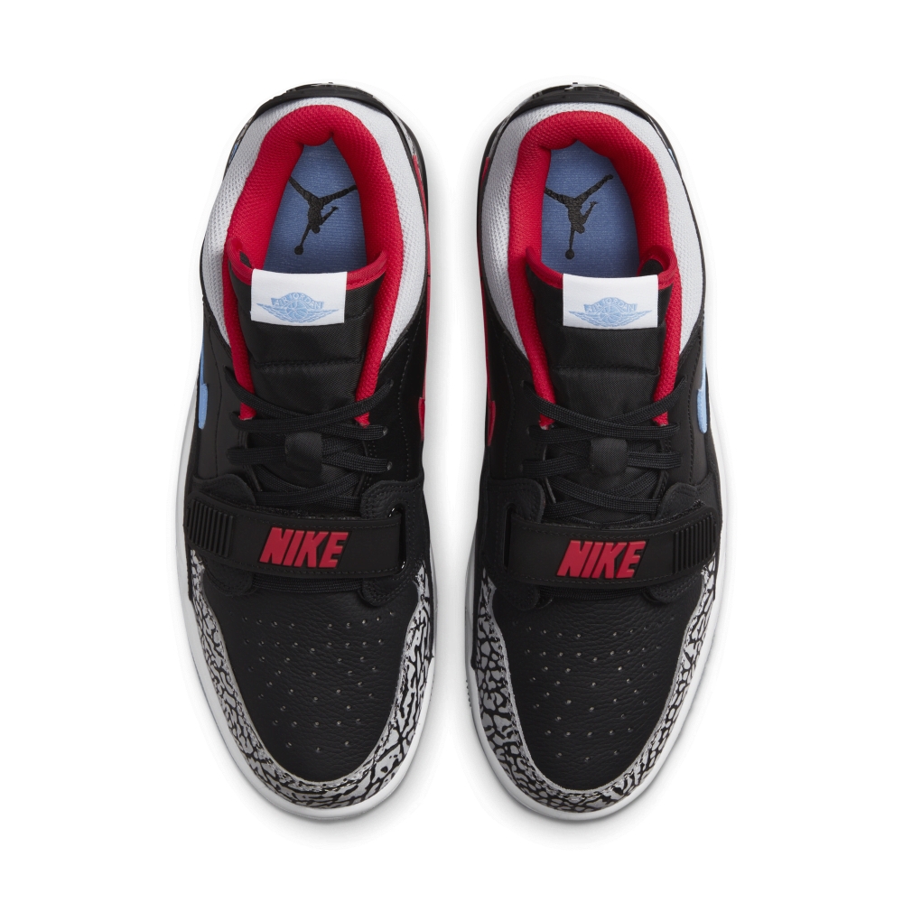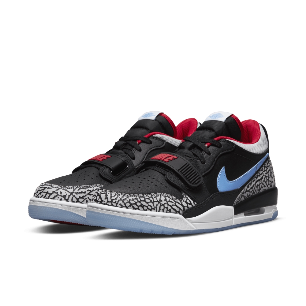 Кроссовки Jordan Legacy 312 Low Black Valor Blue сочетают в себе элементы Air Jordan 1, Air Jordan 3 и Nike Air Alpha Force Low, а их цветовая гамма вдохновлена флагом Чикаго. Кроссовки Jordan Legacy 312 представлены в черной/красной/синей и в сером цвете и имеют верх из черной мятой кожи с контрастными кожаными логотипами Swoosh, синими на боковой стороне и красными на средней. Пятка и перфорированный носок покрыты серой кожей с принтом слона. Подошва из белого пеноматериала имеет видимую вставку Air, а резиновая подошва выполнена в белом и полупрозрачном синем цвете.