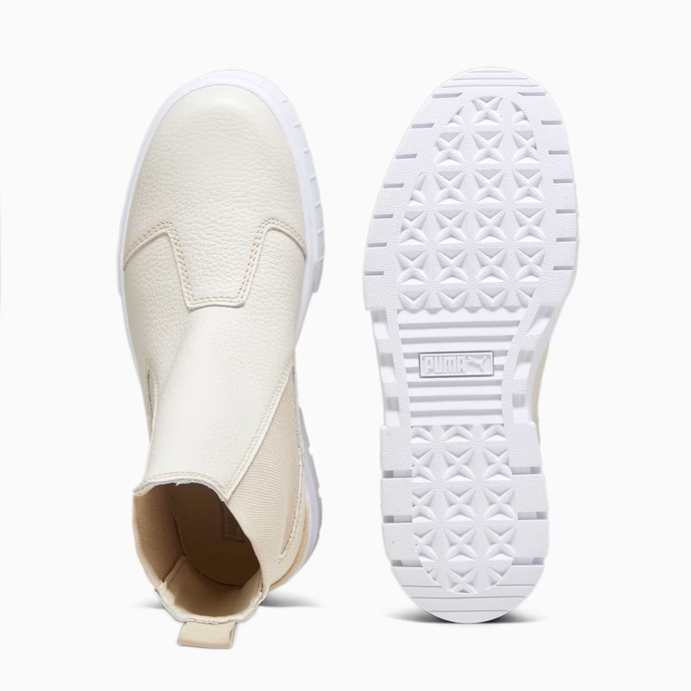 Женские ботинки Puma Mayze Chelsea Luxe Wns Alpine Snow сочетают стиль уличной обуви и удобство повседневной носки, предоставляя современный городской вид с лёгким оттенком классики. Модель основана на культовой линейке Puma Mayze и включает высокие резиновые подошвы и чёткий силуэт, что придаёт этим ботинкам эффектный, "грубый" вид. Эти ботинки используют натуральную кожу, дополняются эластичными вставками и фирменными логотипами Puma. Их конструкция с цепкой подошвой обеспечивает удобство и безопасность на скользкой зимней поверхности. Технология этой модели ориентирована на комфорт и практичность, поэтому добавлены материалы для защиты от холода и влаги, а также высокая подошва, способная амортизировать и распределять давление при ходьбе.