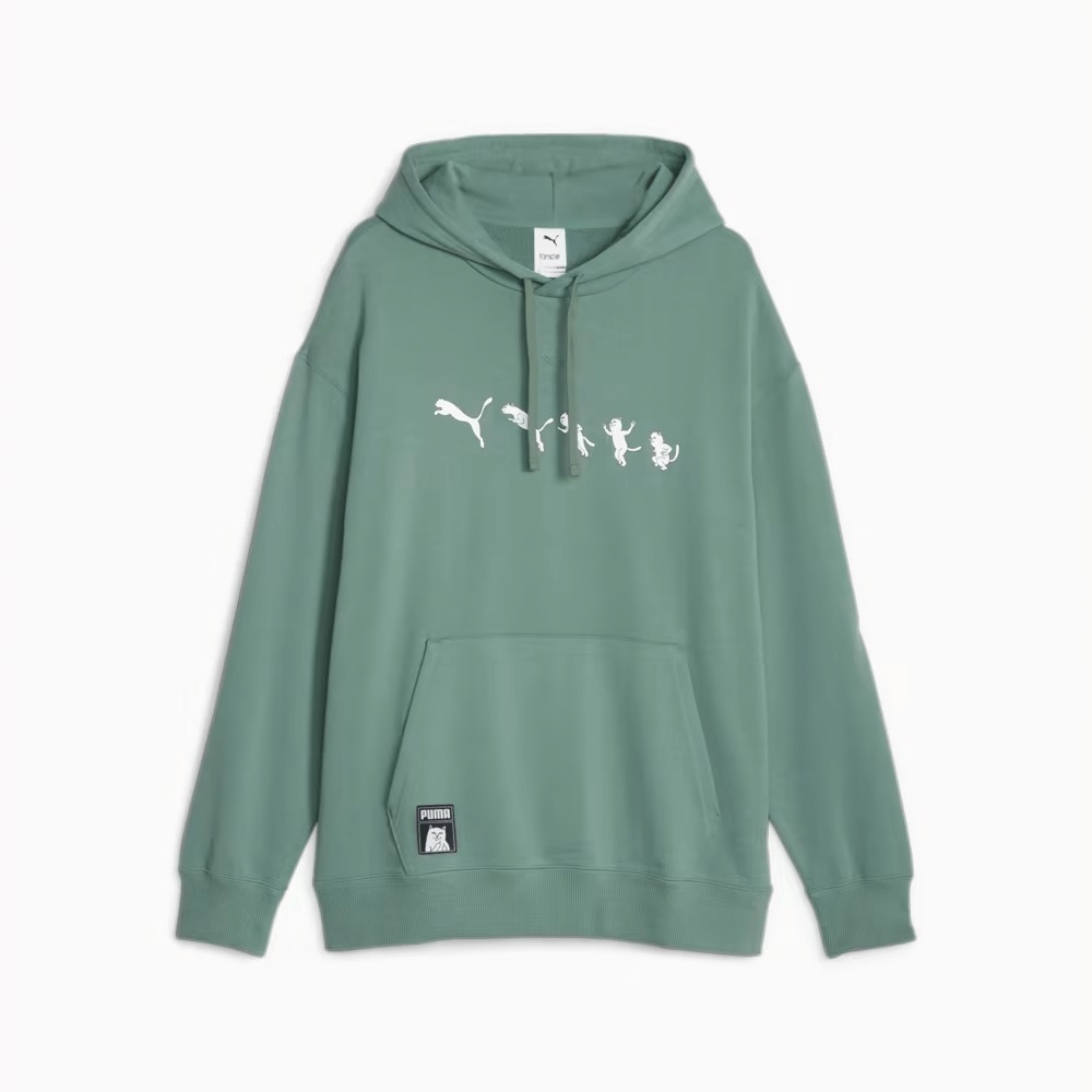 Толстовка Puma X RIPNDIP TR Eucalyptus является частью совместной коллекции между Puma и RIPNDIP, известной своим дерзким и юмористическим подходом к моде. Эта линейка сочетает элементы уличного стиля с качеством Puma, включая уникальные графические решения, где фирменный персонаж RIPNDIP — кот Лорд Нермал — трансформируется в логотип Puma. Коллекция включает расслабленные силуэты и оригинальные детали, делающие её подходящей для повседневного ношения и фанатов уличной культуры. Толстовка изготовлена из смеси хлопка (включая переработанный) и эластана, что обеспечивает комфорт и долговечность. Основной материал — плотный френч терри, что делает вещь теплой и приятной на ощупь